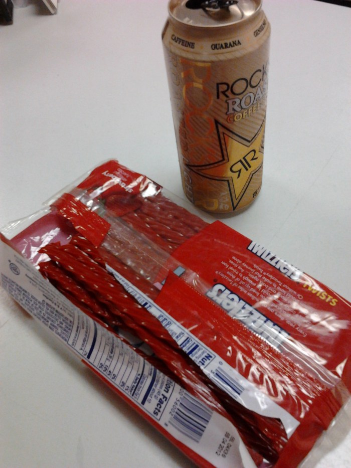 Day One: I got busy on a report for work and ended up eating Twizzlers and a Rock Star energy drink, mocha flavor. I still haven’t stopped twitching.
