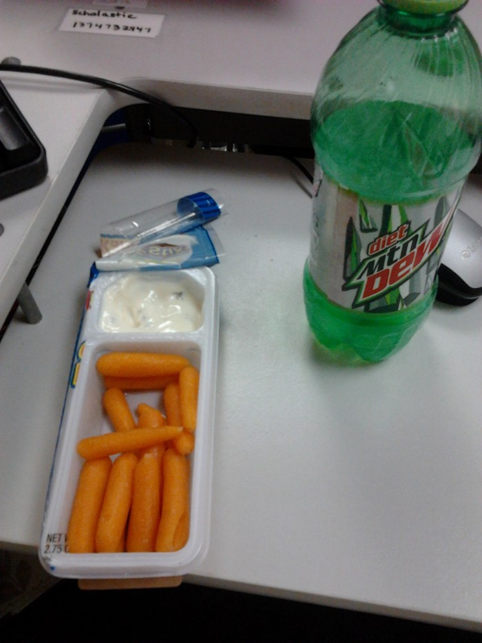 Day Two: I got on a health kick and had a diet Mountain Dew and some carrots with ranch dressing that I bought at the gas station.