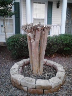 Once upon a time, I had a tree. I can’t say that I luuuuuved the tree, but it was nice and green and really looked cool in front of my house. Now I own a feng shui collection of sticks planted in my front yard. I look like I’m protesting something, only I forgot to tell people what. THIS, my dear friends, is what we in the South refer to as “crepe murder,” a process in which some hapless man doing yard work comes along and gets frustrated with removing every delicate limb of last season’s growth off a crepe myrtle tree, and just hacks it.