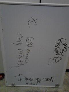 So even though groggy pictures of my daughter with the dog perched on her head never happened (the dog happened, just not the pictures), I did manage to sneak a few pictures with my phone of my daughter’s attempts to communicate via dry erase board. It’s not even in English.