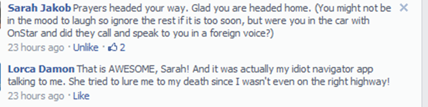 See what she did there? She decided that I hadn’t been beaten down enough and that I was still feeling pretty good about myself, so she had to bring up the innocent little joke I play on my husband from time to time, the one where I pretend to be the OnStar lady and I call him through his car’s Bluetooth then threaten his life.