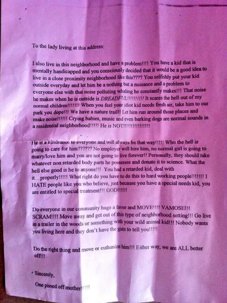 There’s this news story circulating on the internet about a Canadian woman who shoved a typewritten note under her neighbor’s door, complaining in a rather non-sensitive way about the autistic boy who lived there during the summer. The nicest thing this letter had to say was that the grandmother should “donate all his non-retarded body parts” before they had the autistic boy put to sleep. Yes, like a mangy dumpster dog who’s missing an eye and pukes his own blood.